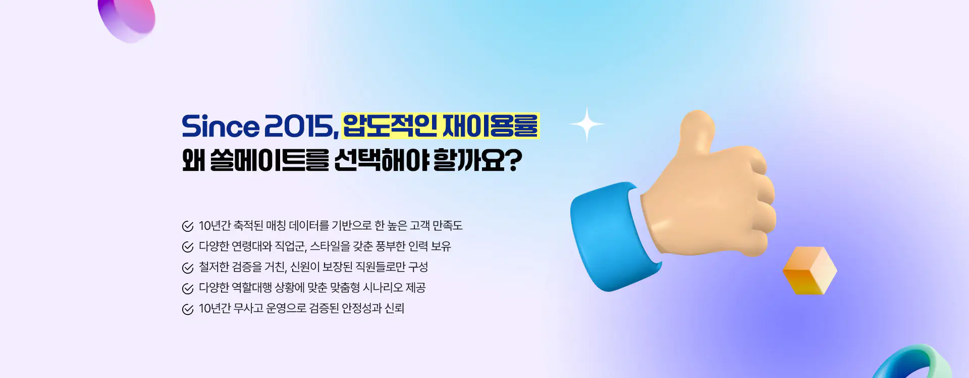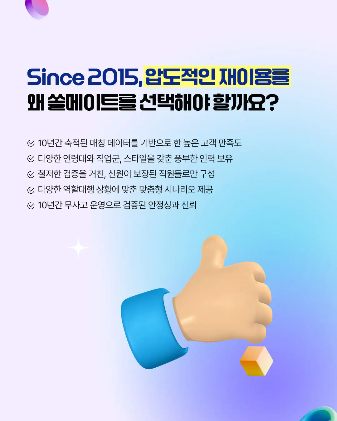 애인대행,여친대행 국내 최초 전문 업체로 출발한 쏠메이트는 꾸준한 데이트 매칭. 소개팅 대행. 연애 및 재회 상담 등 5만건 이상의 상담 및 컨설팅 경력으로 데이터를 분석하여 ‘맞춤형 컨설팅’ 서비스를 제공합니다.